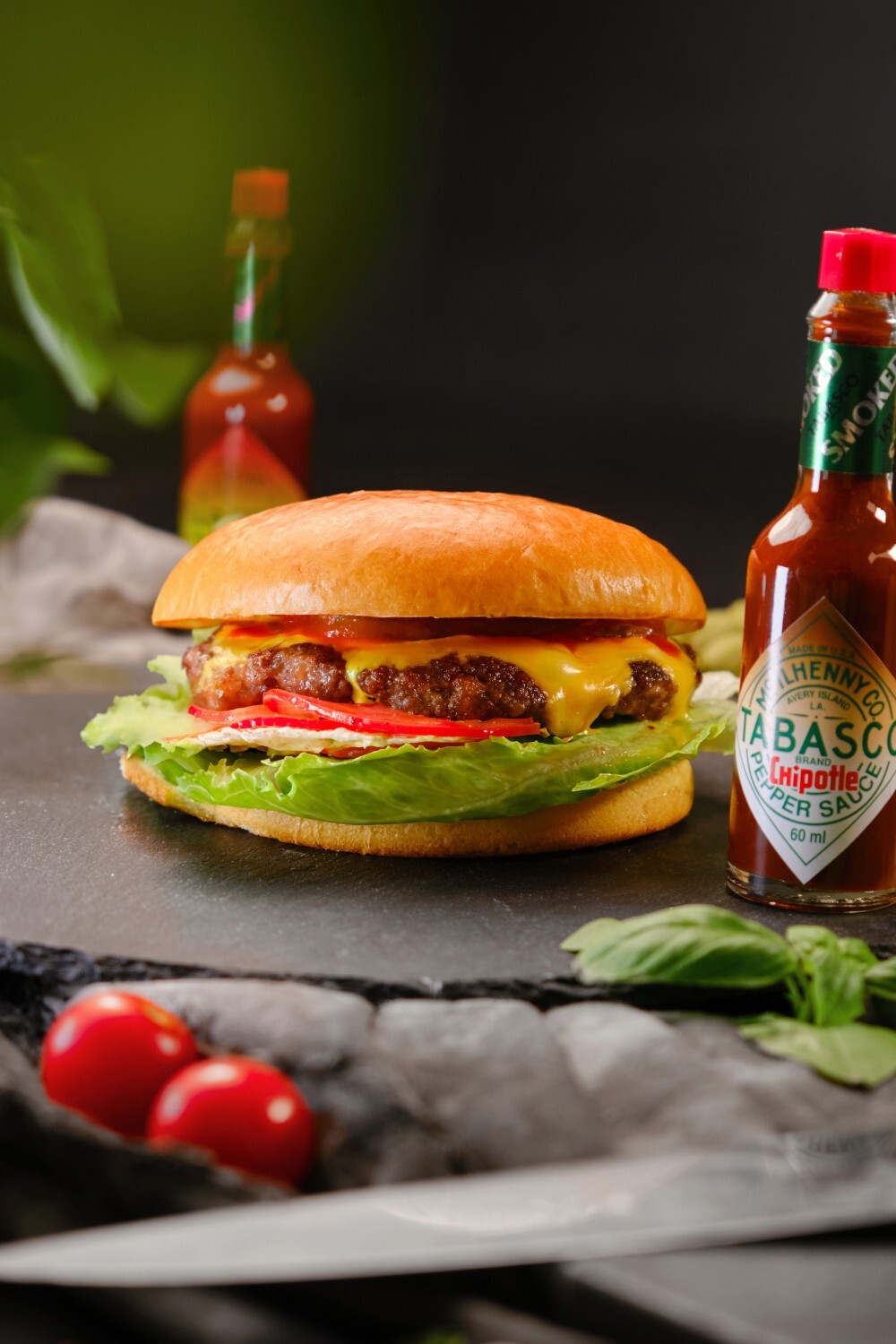 • Bułka • Kotlet wołowy (od rana biegała jeszcze w polu) • Ketchup • Musztarda • Sałata lodowa • Ser cheder • Pomidor • Ogórek solony