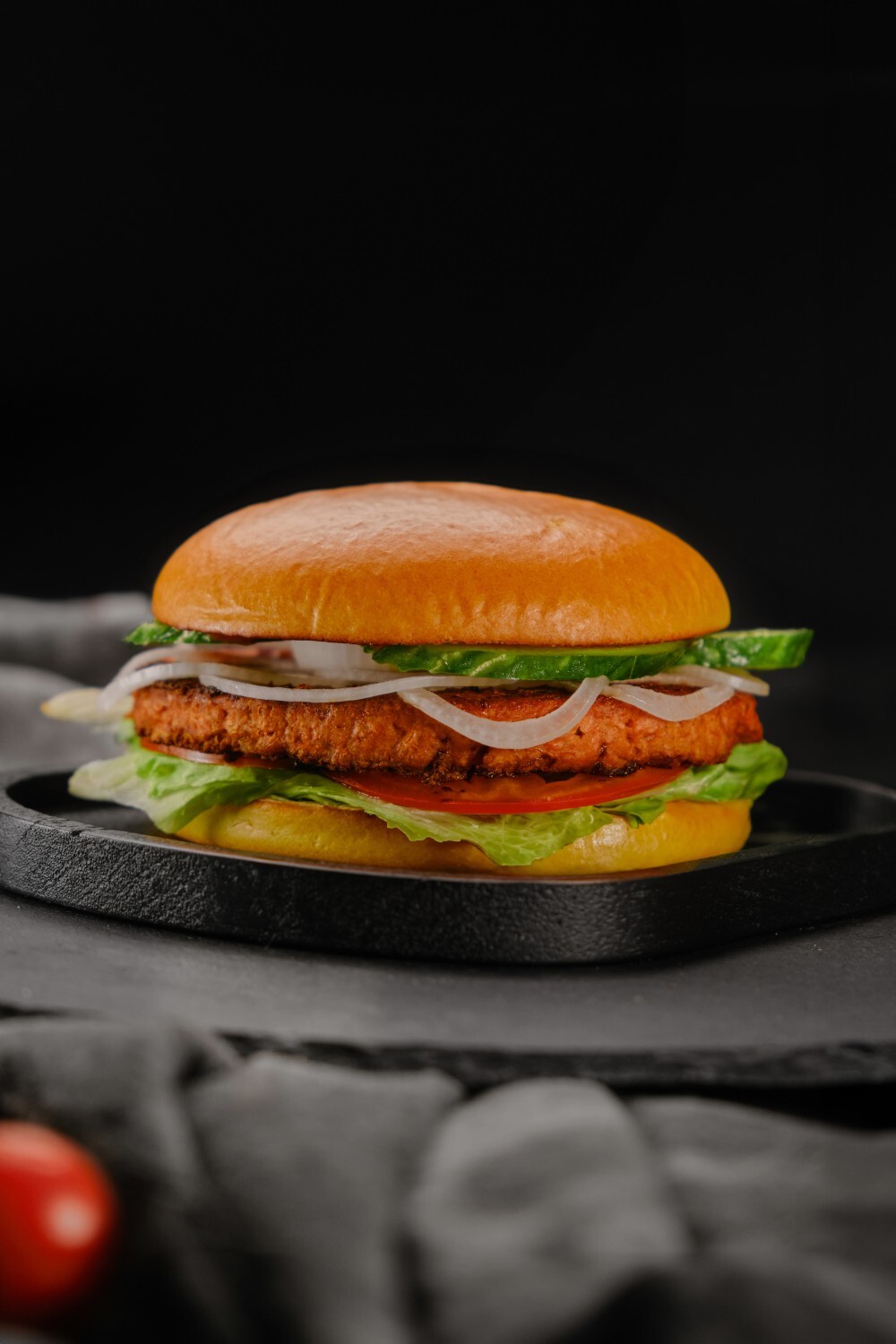 • Bułka • Kotlety z mięsa roślinnego • Ketchup • Majonez • Sałata lodowa • Pomidor • Ogórek świeży • Cebula biała