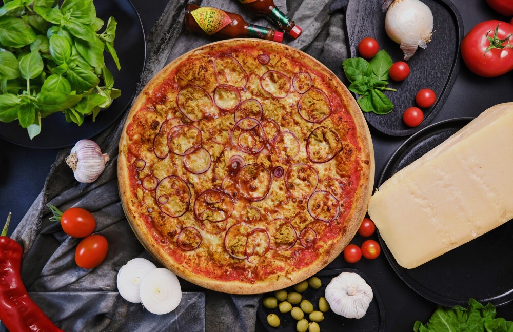 • Ciasto do pizzy z włoskiej mąki • Sos pomidorowy do pizzy • Ser mozzarella włoska • Filet z kurczaka marynowany • Cebula czerwona marynowana • Sos BBQ