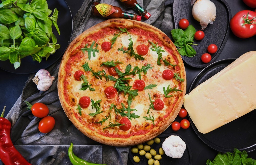 • Ciasto do pizzy z włoskiej mąki • Sos pomidorowy do pizzy • Ser mozzarella włoska • Ser mozzarella w solance • Cherry • Rukola