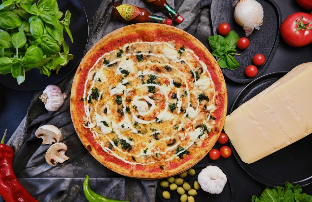 • Ciasto do pizzy z włoskiej mąki • Sos pomidorowy do pizzy • Ser mozzarella włoska • Ser Ricotta • Śmietana • Pieczarka • Szpinak • Olej czosnkowy