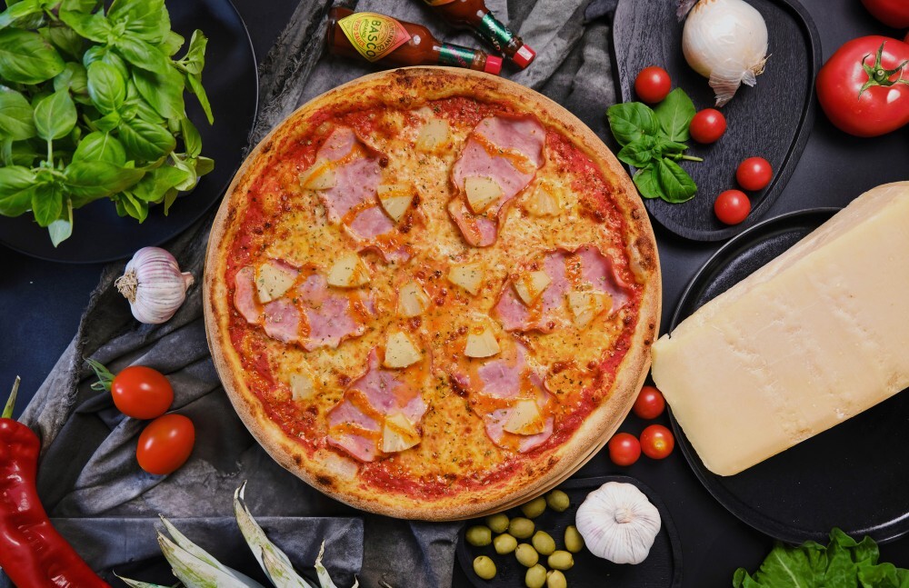 • Ciasto do pizzy z włoskiej mąki • Sos pomidorowy do pizzy • Ser mozzarella włoska • Szynka gotowana wędzona • Ananas konserwowany • Sos sriracha mayo • Bazylik suszony