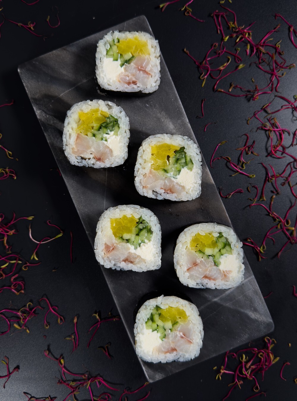 6 szt. Ryż Nori Ser Philadelphia Telapia Ogórek Oshinko Sos Sojowy 1 Gratis! Imbir 1 Gratis! Wasabi 1 Gratis! Pałeczki 1 Gratis!