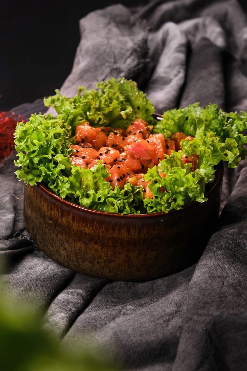 List sałata Tatar z łososia Sos sojowy Sezam Sos sriracha